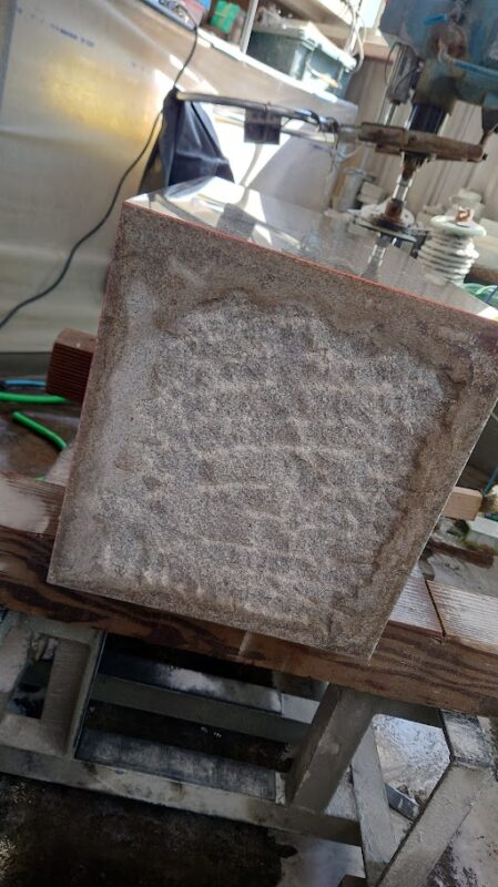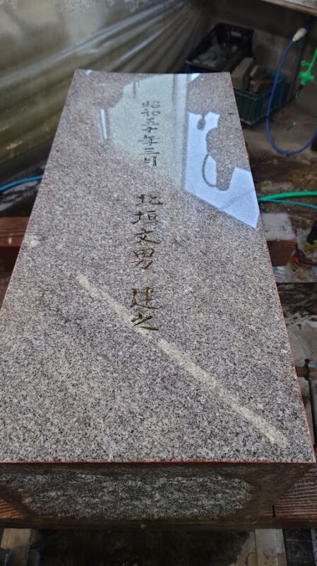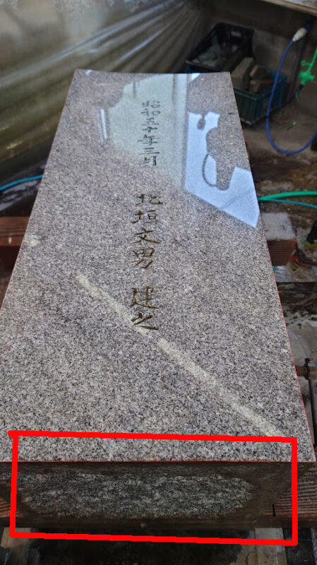 ですが、現在はお墓の建て方は大きく変わり、接着工法となり、このような、くぼみはむしろ必要ない、というよりやってはいけない加工となりました。接着剤を使用するので、窪んだ分、接着剤が多く必要となり、場合によっては接着不良となりかねないのです。