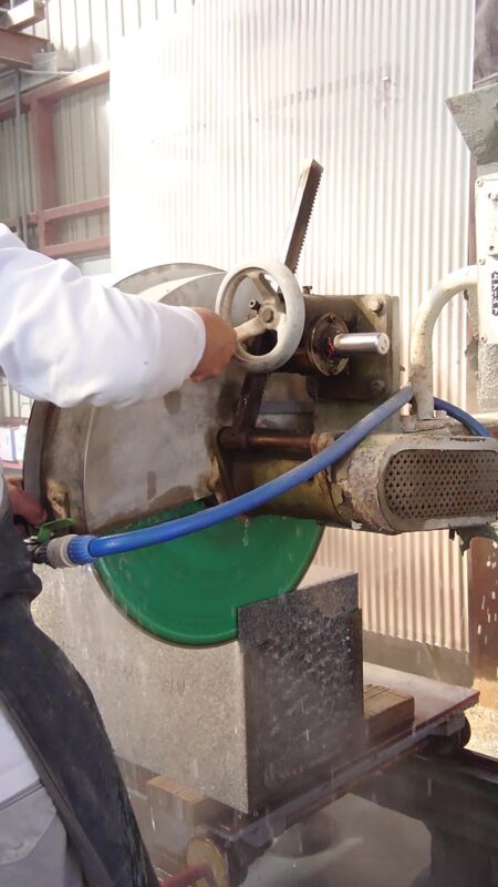 これは昔のお墓の工法での加工した様子です。昔はお墓の台石の上に竿石を載せるだけ、だったんですが、載せた上の石がしっかり安定すればいいのですが、微妙に隙間ができて、カタカタと動くことがよくありました。完全にまっすぐに加工することが難しかったから。それで、中の部分をえぐって、へこませて、石と石が接する部分を半分くらいにして、石同士を安定させたんです。
