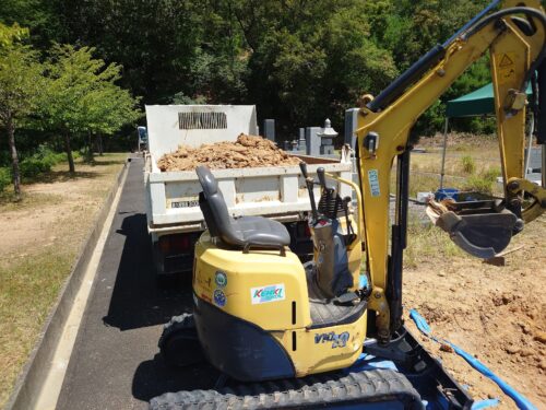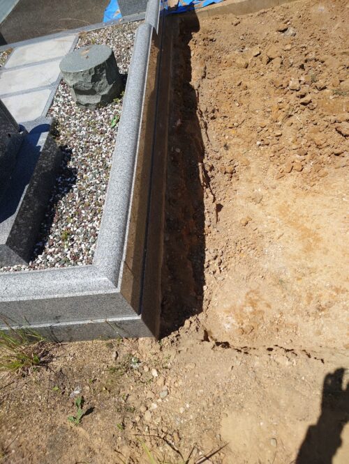 このように、隣のお墓との境界はしっかりと掘削できませんでしたが、掘り進んだ場所に砕石を入れていきます。
