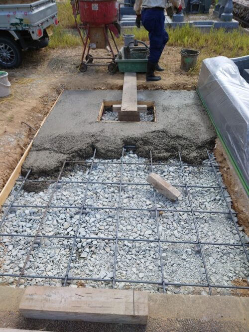 生コンクリートを流し込みます。強度は24(呼び強度24)。カラ練の生コン(水の量が少ない状態の生コン。質量が多少軽く、運搬しやすい)を現場で水を加えて練って施工するので、JIS規格ではなく、正式な呼び強度24出ているかどうかは不明ですが、通常よりも高スペックのコンクリートになっているはずです。