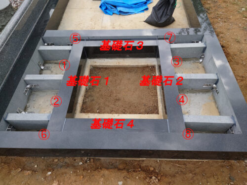 基礎石が1から4まであります。そのうち基礎石3と基礎石4はそれぞれ3は写真上の石と接着しております。4は写真下の石と接着しております。固定金具が設置できないので、石と接着することでずれ、傾きに対処しております。
