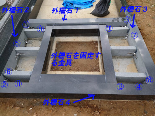 外柵石3は③と④で隣同士の石と固定。⑦と⑧で基礎と固定。外柵石4は②と④で隣同士の石と固定。⑪と⑫で基礎と固定。とそれぞれの石は隣の石と固定するのに、左右両端に1か所ずつ合計2か所。基礎とは2か所で固定と合計、一つの石に4か所で固定しております。
