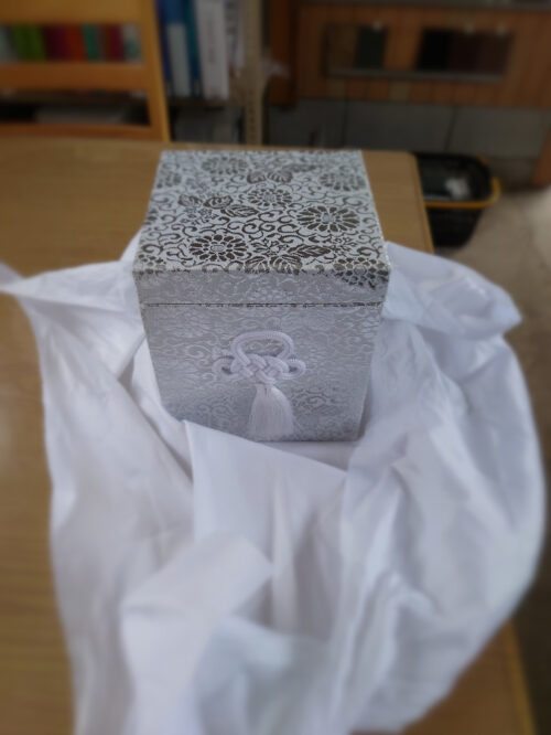 写真のように、自宅にお祀りしているときは、白い立派な箱に納めて、白い布にくるんで仏壇の隣か前の祭壇に安置してあると思います。その時はそれでいいのですが、お墓に納めるときは、このままではダメです。