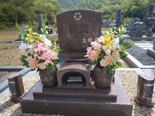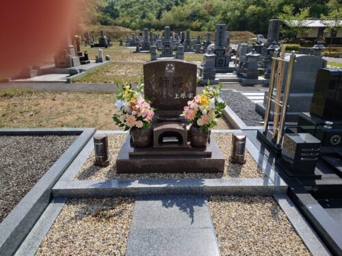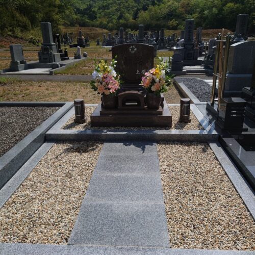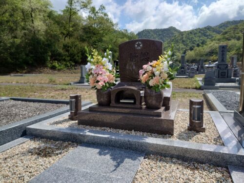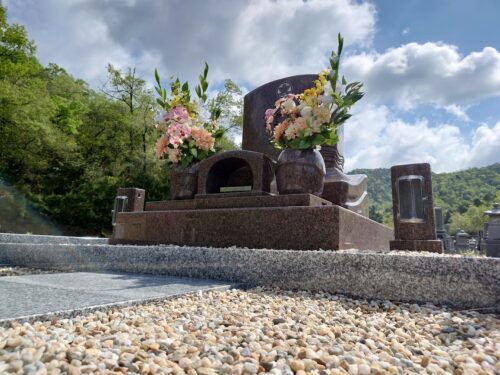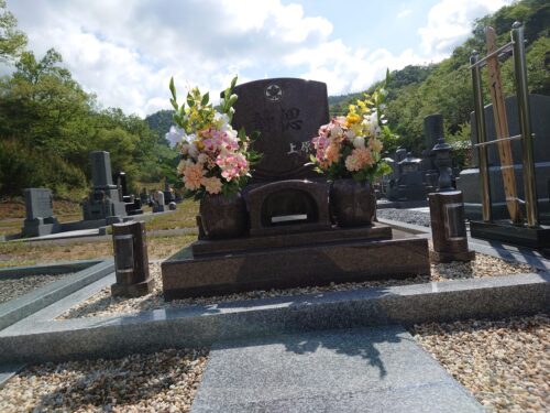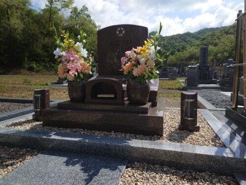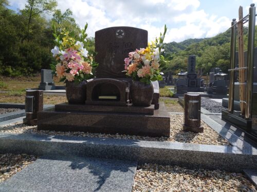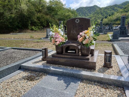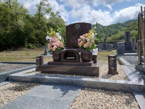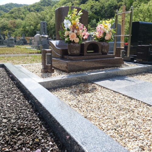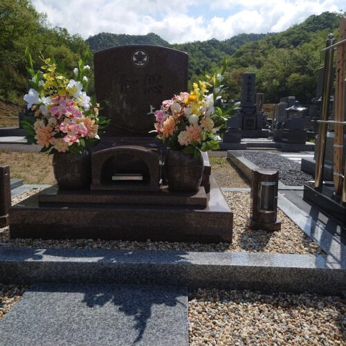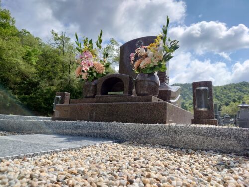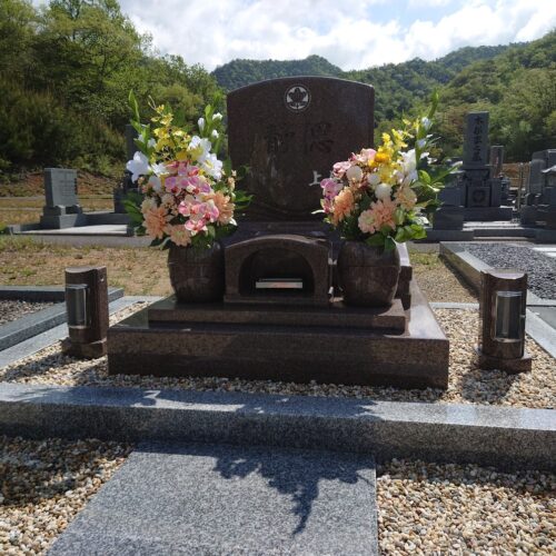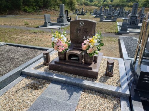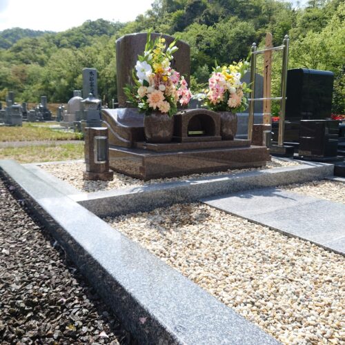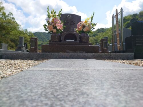 お墓本体は北欧、スウェーデン産のブラウン系の銘石、「バーハス」という石です。あまり日本では見かけない希少な石です。