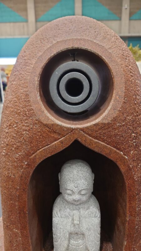 花筒、鳴らし棒(調べたら「リン棒」と呼ぶらしい)がブラウン系でおりんは「サヌカイト」といういい音色が出る石が黒なので、敢えて色をその系統に塗って、白いお地蔵様を浮き出させている、というアイディアではないかなと思いましたが、それなら、それはうまくまとまっているので、全然ありかと。