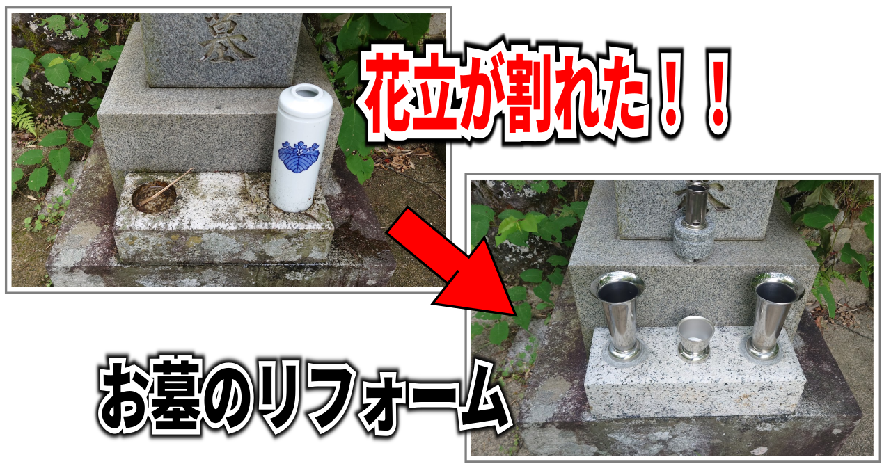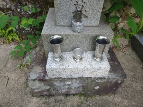 このような花立、香立てを別途用意する、という方法もあります。ただ、お墓が古い石になっているので、同じ石があるかどうかがまず問題となります。