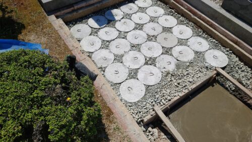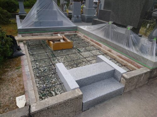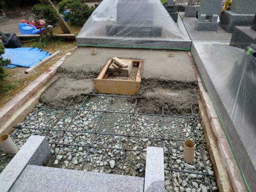 今回も地震に強いお墓。トップベース工法なので、コマを並べました。今回は費用の関係で半分、トップベース、半分通常の基礎のハイブリッド。