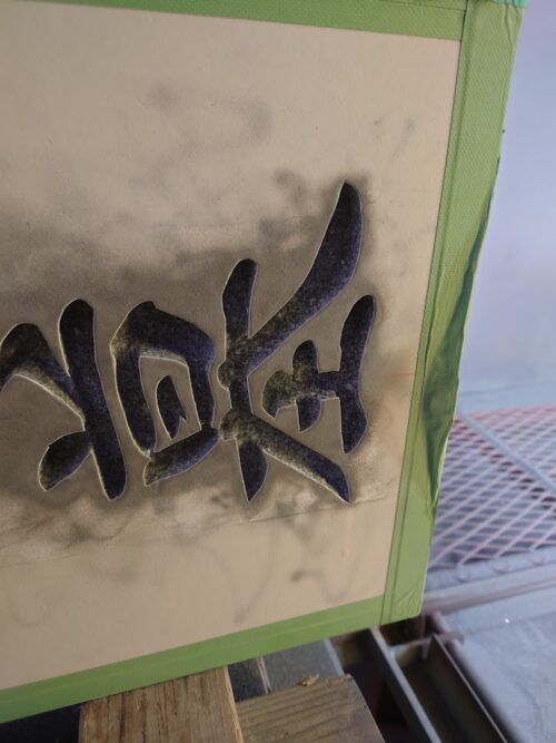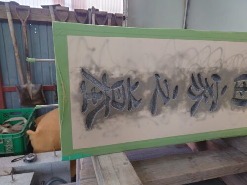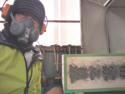 真冬の寒気が居座って、雪が降り続く2月ですが、文字彫刻は最も寒い作業です。高圧エアを石に吹き付け続ける作業なので、指先がとんでもなく冷たくなります。そのエアが飛び出す先が凍り付くときもあるので、長時間の作業は難しく、他の時期より長くかかります。