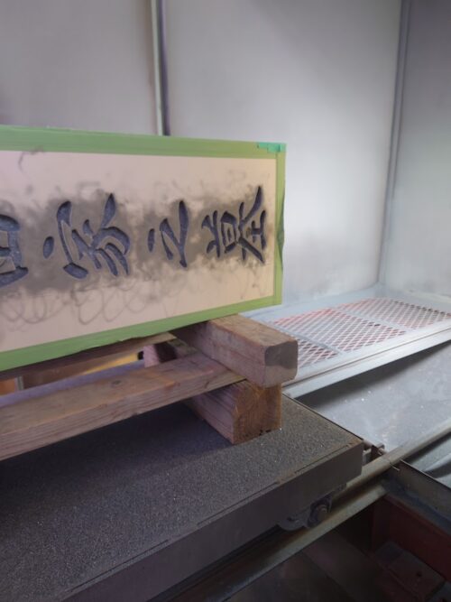 冬の文字彫刻は大変寒いので、なかなか厳しい作業となります。体は着込めばいいんですが、指先が専用の分厚い手袋していても、すぐに冷たくなってしまい、ほんとに大変です。