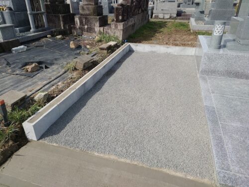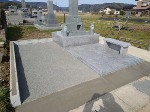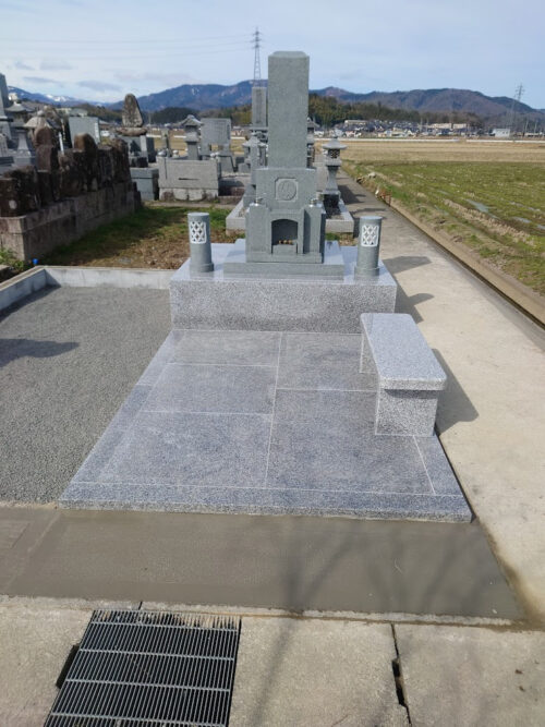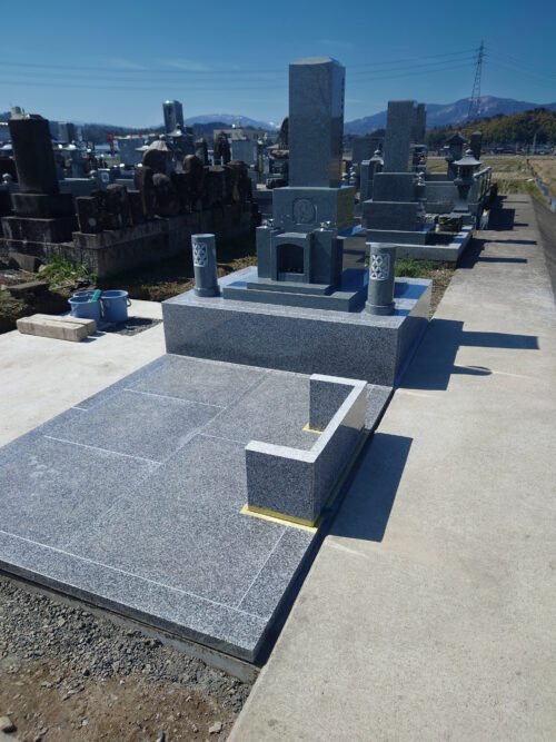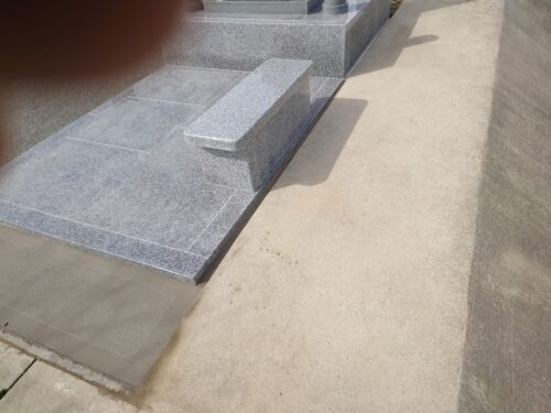 墓地と溝蓋の間は官地ですが、そのままではお参りしづらいので、コンクリートを施工。周囲の境界も整理して、すべて完成しました。