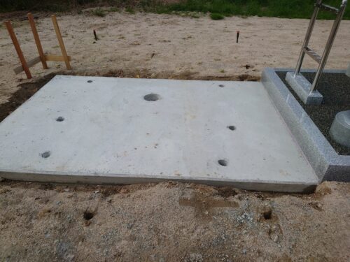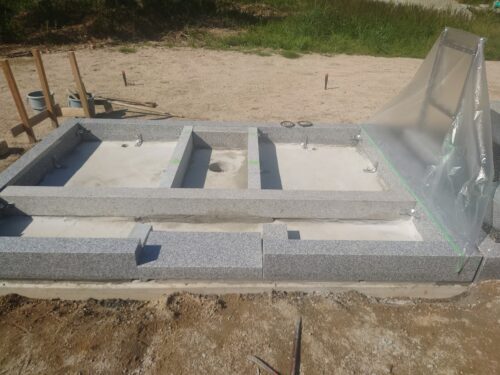 新しい墓地へ石を運ぶ、とはいっても、ただ置いたらオッケーというわけではありません。合計で1トン以上もあるお墓の石を安全に、正確に、長時間(50年以上も!!)同じ場所に設置し続けるわけですから、それなりの対策をしないと、簡単に倒れてしまっては台無しです。