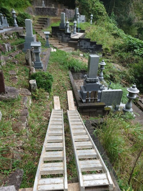 お墓の石をすべて持って下ろして、必要な石は新しい墓地のところへ。必要ない石などは、持って帰り処分させていただきます。