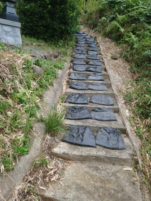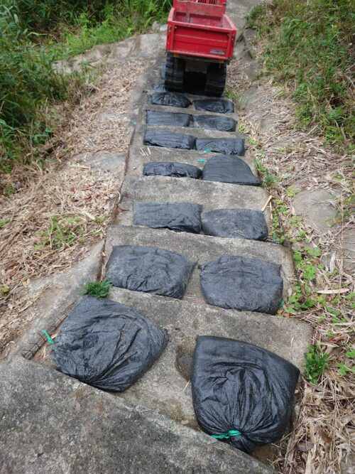 階段はこのように、土のうを敷いて、段々をスロープにします。そうしないとうまく通れないからです。