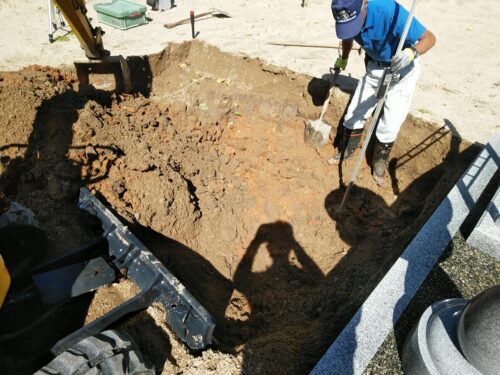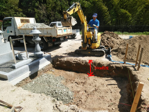 とはいえ、隣の区画のお墓は10㎝程度の基礎コンクリートしかないので(その下の砕石層も10㎝程度)あまり深く掘ると隣のお墓に影響が出そうで、怖いので、50cm程度の深さにします。
