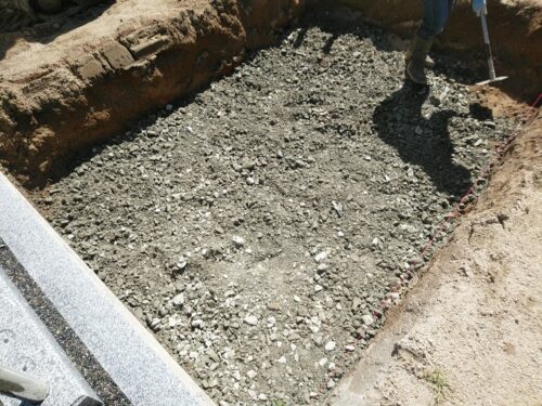 50cm程度掘ったら、砕石を入れてい行きます。少しずつ入れていき、転圧(機械で踏み固める)しながら、更に少しずつ、という風に入れていきます。たくさん入れた方が早いように思えますが、たくさん入れると転圧(機械で踏み固める)しても、固まるのは表面だけで、内部は全然固くならないのです。