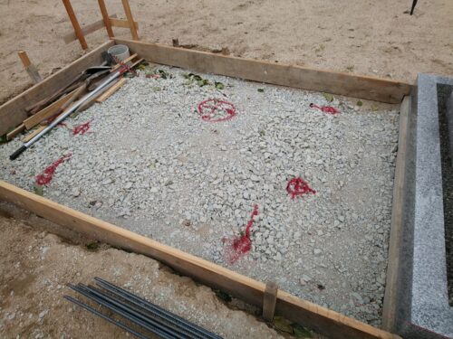 徐々に砕石を入れていき、機械で踏み固めて、規定の高さになったら、基礎コンクリートを作る準備に入ります。基礎コンクリートの外枠になる木の型枠(外枠)を設置。赤色のスプレーで「息抜き穴」と「水抜き穴」の位置を記して、