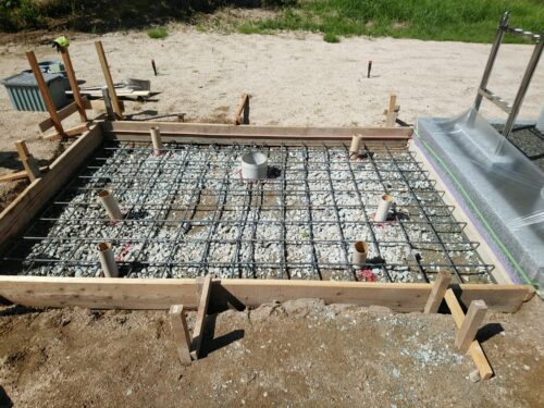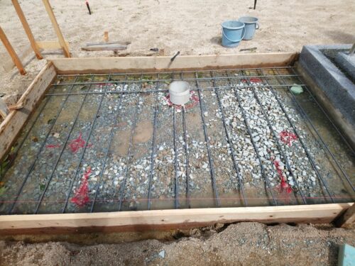 基礎コンクリートもしっかりと固まりました。コンクリートの端、色が変わっていると思いますが、これは、レイタンス除去作業といって、コンクリートは固まる工程で不純物が表面を覆うので、それを削り取る作業の後、表面に接着剤を塗ったので、色が変わっています。