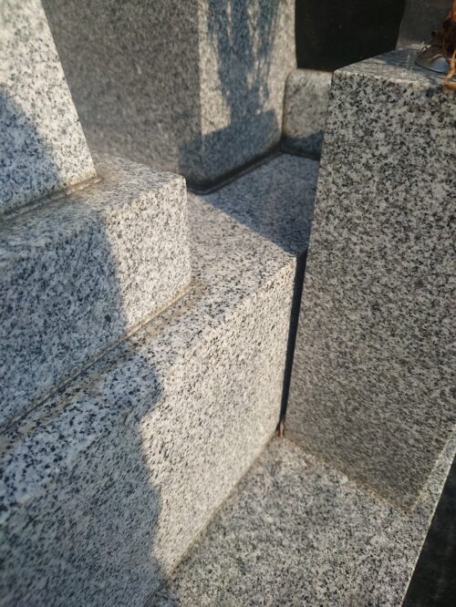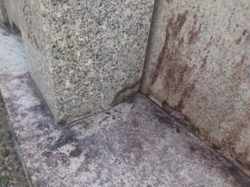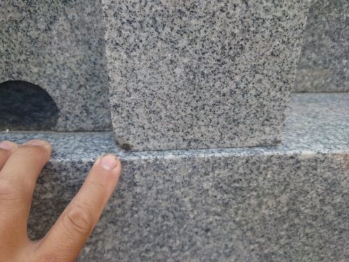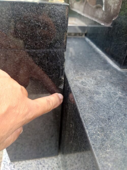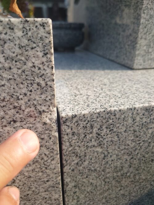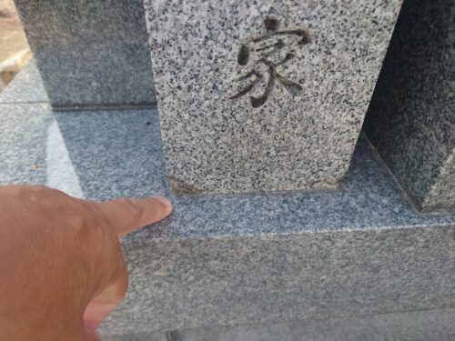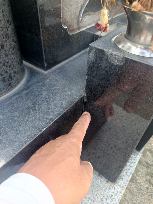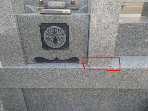 このように大きく欠損しているものもよく見ます。古いお墓ならまだ仕方ないと思いますが、新しいお墓がこのように大きく欠けていると、とても残念に感じます。