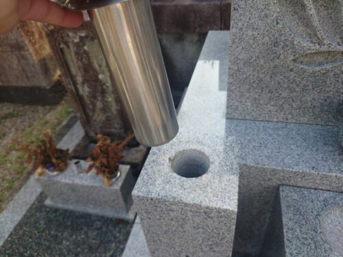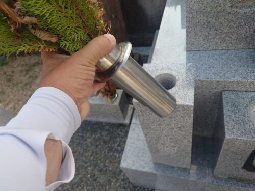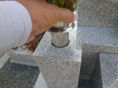 上の写真のように、花立は今や、石に直接お花を挿すのではなく、ステンレスの筒にお花を挿すようになっています。このステンレスの筒の中に水を入れて、そのまま花立石に差し込んで、お花をお供えするというスタイルがほぼ92%です。(おおきた石材店調べ)