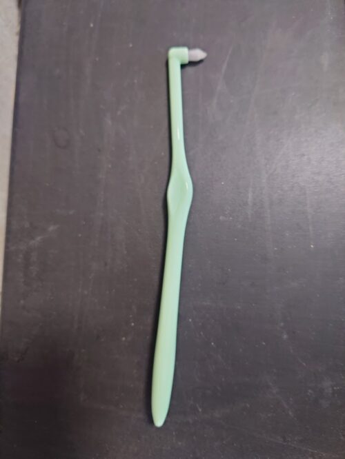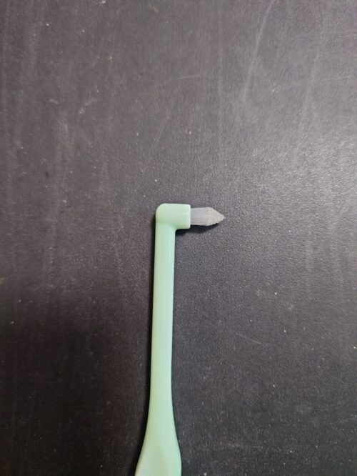 歯のすき間を一点集中で磨く歯ブラシで、毛先が1点になっています。その分、ヘッドも小さく