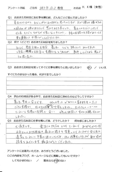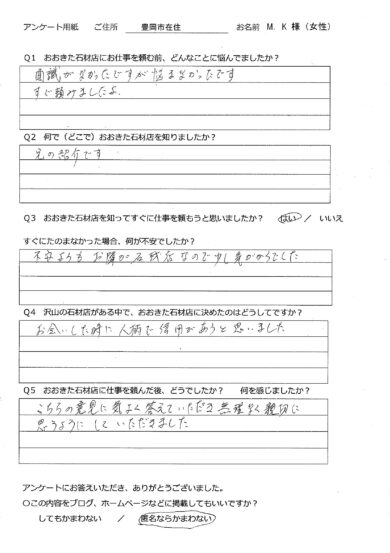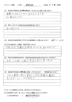 【 ブログ】 一覧 4.石のこと 戒名碑のリフォーム工事のご依頼 2019/09/13 ブログ お墓の構造【地震に弱いお墓】 2019/09/12 ブログ お墓じまいのお客様から【お客様の声 32】頂きました。 2019/09/06 ブログ お墓を建てる意味を知っていますか? 2019/08/25 ブログ 【石は欠けやすい】使い勝手の悪いお墓 2019/08/18 4.石のこと 【お客様の声 31】を更新しました。 2019/08/17 ブログ 「終戦の日」です 2019/08/15 ブログ 【豊岡初】デザイン墓石〈禅〉施工 2019/08/15 ブログ 【豊岡西霊苑D区画】四ツ石の秘密 2019/08/14 4.石のこと 【豊岡西霊苑D区画】二重台と三重台のお墓の違い 2019/08/13 < 1234567 > >>
