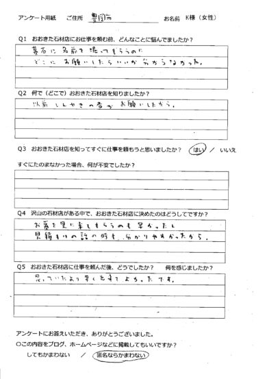 【 7.お知らせ】 一覧 7.お知らせ 岩田さんのお花(アーティフィシャルフラワー) 2019/02/22 7.お知らせ インドの魅力的な石でお墓を建てました 2019/02/21 4.石のこと スマートコレクションシリーズ 和洋タイプができました。 2019/02/01 7.お知らせ 「スマコレ」洋型シリーズが完成。①~⑥まで 2019/01/20 7.お知らせ お墓の地震対策について 2019/01/15 4.石のこと スマートコレクション、洋墓2と3もできました。 2019/01/12 7.お知らせ 私らしいメニューページが出来そうです。 2019/01/10 7.お知らせ 「お墓のねだん」2品目目は「大樹Ⅰ」です。 2019/01/06 7.お知らせ ホームページをメンテナンス中です。 2019/01/05 7.お知らせ 「お客様の声」のページを更新~おおきた石材店が選ばれた理由 2019/01/03 < 1234567 > >>