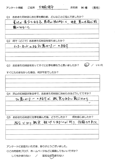 【 お墓じまい】 一覧 5.お墓の疑問 Q235~お墓じまいの費用に影響する4つの事①お墓の石の量 2016/06/01 ブログ 「お墓じまい」の見積金額は、大きく変わる可能性があります。 2016/05/31 5.お墓の疑問 Q225~お墓に分割支払いって出来るの? 2016/04/22 7.お知らせ 「お客様の声」12 を更新しました。 2016/03/31 3.お墓のリフォーム お墓の解体工事の費用について 2016/03/31 4.石のこと お墓じまい、完了しました。 2016/03/24 4.石のこと 骨出しのお手伝い。 2016/03/20 5.お墓の疑問 Q206~墓じまいの時のお菓子はどうするの? 2016/03/14 7.お知らせ 「お墓じまい」のまとめ 2016/02/16 5.お墓の疑問 Q138~両家墓④-両家墓はどんな場合?のまとめ 2016/01/14 12345678