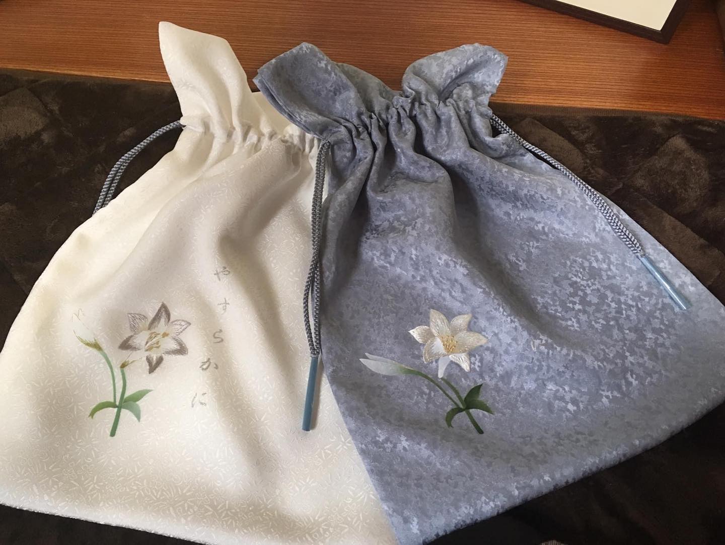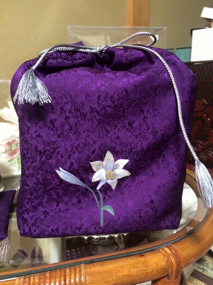 ・文字の刺繍は極めて細い金の糸、銀の糸で刺繍し、ほつれにくいように重ねて縫っていきますので、一日に刺繍できる数が限られます。ですから価格が他より高価になりますが、一針一針心を込めて、伝統工芸士の技術で刺繍していきます。極めて価値の高い作品となりますし、大切なご家族のご遺骨を納めるためのものとしては、他に比較できるものがない一品です。