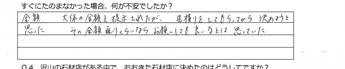 【おおきた石材店が選ばれた理由】 最初にお寺でお話を聞いているときの大北さんの誠実そうな人柄が良かった。 見積額も最初に聞いた位(最初、口頭で概算見積額をお伝えしていた)で良心 … 続きを読む 09 豊岡市 N.Iさん 女性