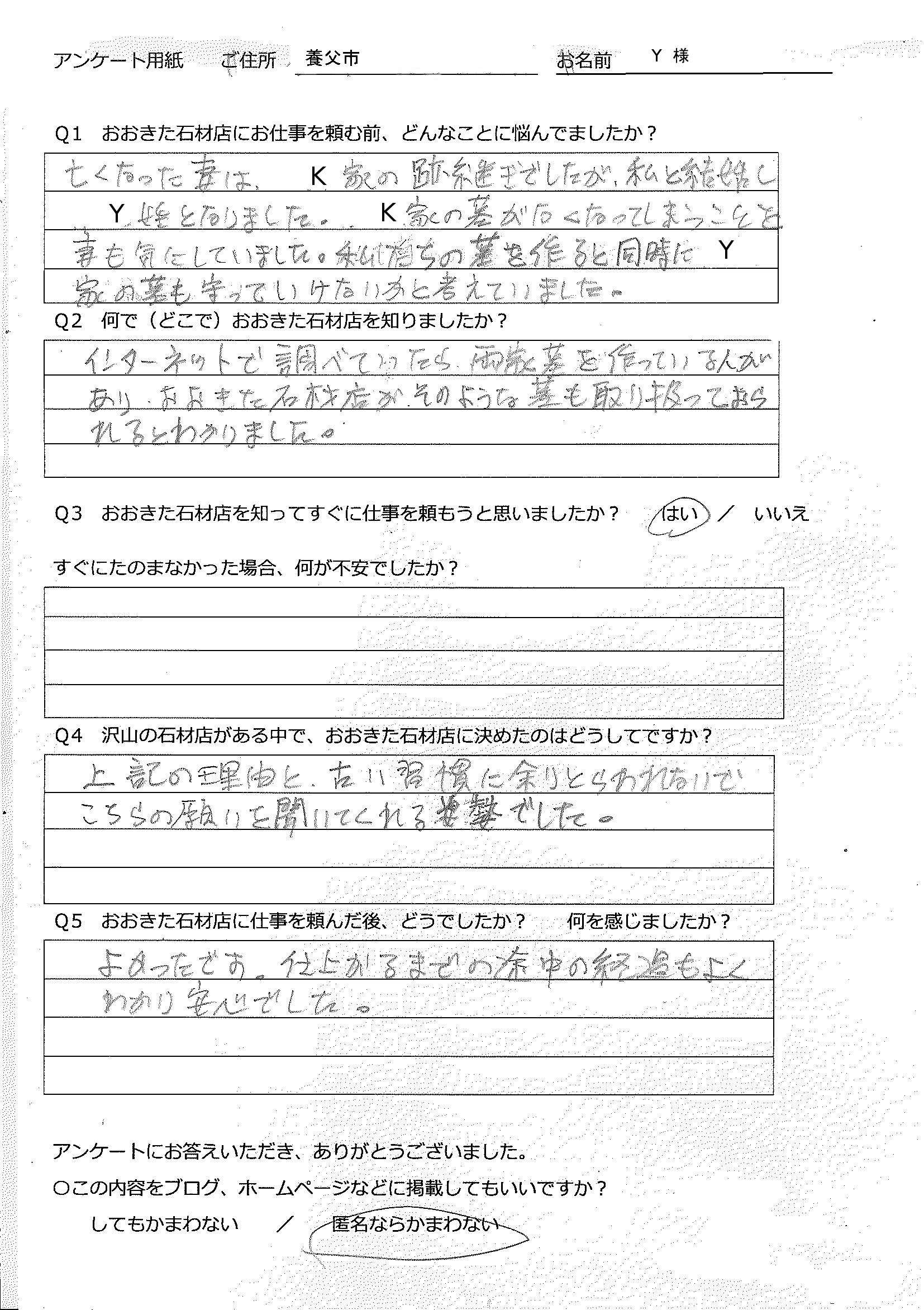 【おおきた石材店が選ばれた理由】 ネットで調べて両家墓を取り扱っていたから。 古い習慣に囚われないで、こちらの願いを聞いてくれる姿勢。 ネットでお問合せ頂いて、現 … 続きを読む 20 養父市 Y様 (男性)