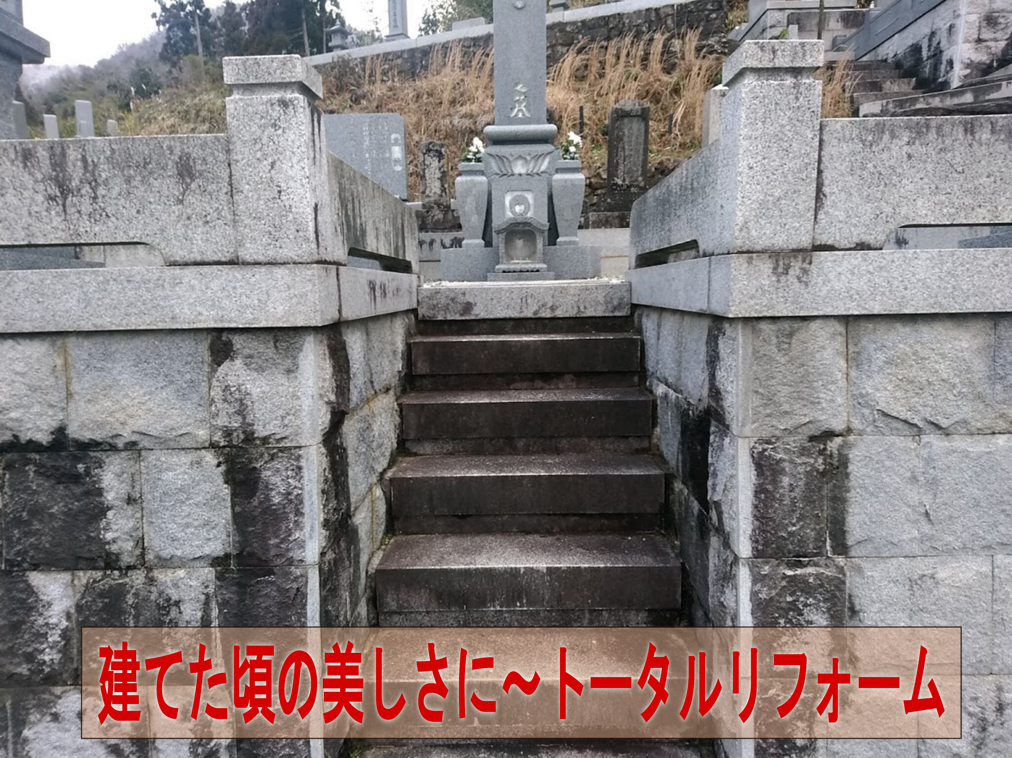 お墓が建って20年以上経過して、全体的にかなり汚れが目立つお墓。全体的な汚れ落としと草が生えないように、それからご先祖様のお墓をある程度整理して、お参りしやすいお墓へリフォームしました。